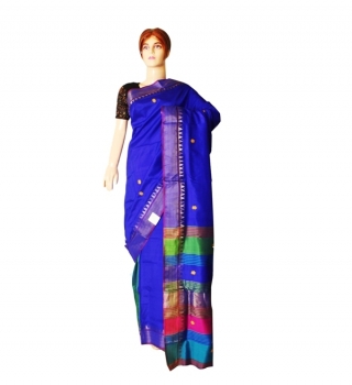 High quality Kataan Silk Embroidered Saree. It is an Indian Handloom product. Plain blue body, yellow embroidered butis, multicoloured pallu and contrast plain bluish green blouse piece. Perfect for Party Wear. Fast Colour. Only Dry Clean Recommended.