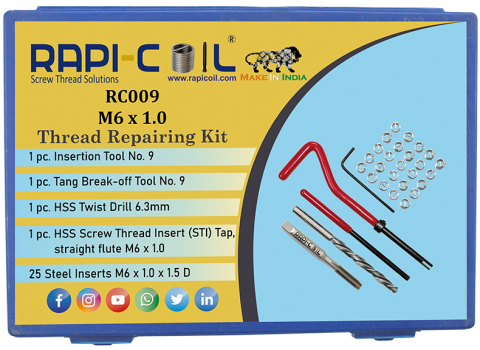 Article no. RC009 Size. M6 x 1.0 Contents High Speed Steel Screw Thread Tap M6 x 1.0 - 1pcs, HSS Twist Drill 6.3mm - 1pcs, Insert Installation Tools No. 9 - 1pcs, Break-Off Tang No.9 - 1pcs, Stainless Steel Helical Insert M6 x 1.0 - 25pcs.