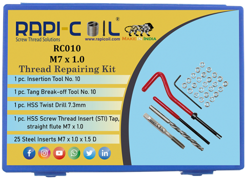 Article no. RC010 Size. M7 x 1.0 Contents High Speed Steel Screw Thread Tap M7 x 1.0 - 1pcs, HSS Twist Drill 7.3mm - 1pcs, Insert Installation Tools No. 10 - 1pcs, Break-Off Tang No.10 - 1pcs, Stainless Steel Helical Insert M7 x 1.0 - 25pcs.