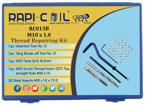 Article no. RC013 Size. M10 x 1.5 Contents High Speed Steel Screw Thread Tap M10 x 1.5 - 1pcs, HSS Twist Drill 10.4mm - 1pcs, Insert Installation Tools No. 13 - 1pcs, Break-Off Tang No.13 - 1pcs, Stainless Steel Helical Insert M10 x 1.5 - 20pcs.