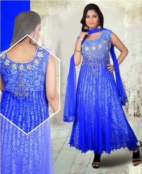 Royal Blue embroidered festival anarkali kameez intricate with zari thread, stone work, brasso work, neck work, floral work, patch work and leaf work.No embroidered work is done on the backside of the kameez.Available with Royal Blue Shantoon Churidar and Royal Blue Net Dupatta.This ready made kameez is available upto chest size 42 with matching sleeves of 5-6 inches.
