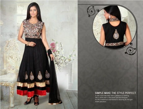 Black embroidered festival anarkali kameez intricate with zari thread, stone work, sequins, neck work, floral work, patch work, leaf work and patch patti border work with lace.No embroidered work is done on the backside of the kameez.Available with Black Shantoon Churidar and Black Net Dupatta.This ready made kameez is available upto chest size 42 with matching sleeves of 5-6 inches.