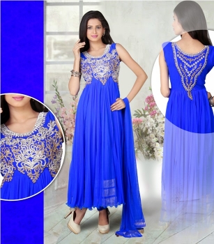 Royal Blue embroidered festival anarkali kameez intricate with zari thread, stone work, neck work, floral work, patch work and leaf work.No embroidered work is done on the backside of the kameez.Available with Royal Blue Shantoon Churidar and Royal Blue Net Dupatta.This ready made kameez is available upto chest size 42 with matching sleeves of 5-6 inches.