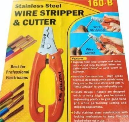 Overall Length 8 Inch Brand Multitec Material Mild Steel Usage/Application Industrial Warranty 6 Months Model Name/Number 160B Packaging Type CARD AND BLISTER Insulation On Handle Yes Country of Origin Made in India Wire Stripper160B Stainless Steel Wire Stripper & Cutter Features Overall length: 200mm. Capacity: Cut & strip Electrical wires & cables upto 10 sq.mm or upto 12 mm in dia. Material: High Grade Stainless Steel blades. Handle: High performance engineering plastis. Application: Specially designed for cutting and stripping electrical wires. Additional Info : 1.Solid stainless steel construction with locking mechanism to keep the tool locked when not in use. 2.Meant for professional electricians Additional Information: Item Code: 82032000 Production Capacity: AS PER THE ORDER Delivery Time: IMMEDIATE Packaging Details: SINGLE PIECE PACKED IN BLISTER AND CARD AND THEN 10 PCS IN A BOX AND MASTER CARTON IS OF 200PCS
