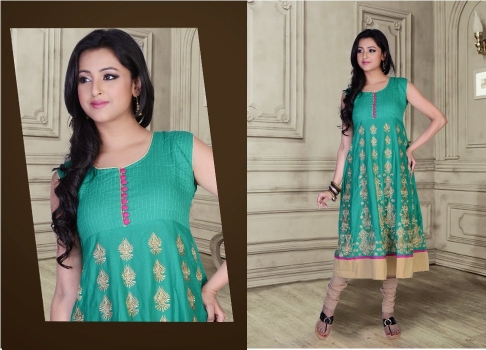 Persian Green embroidered festival kurti intricate with resham thread, zari thread, buttons, stripes work, floral work, leaf work and patch patti border.This kurti is readymade and is available upto chest size 42