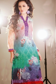 Digital Printed Lush Apricot, Bluish Purple & Greenish Blue Ready Made Kurti.