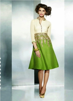 Divine Buttercream & Lime Green Ready Made Kurti with Lace|Resham.