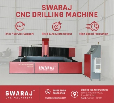 Machine Type Automatic Material Stainless Steel Spindle Speed 4P 6000 RPM Spindle Taper BT30 Weight 15000 Kg Model SCM 3030 Job Material Tube Sheet Manufactured By Swaraj CNC Machinery Minimum order quantity: 1 Piece Swaraj CNC Machinery, headquartered in Surat, is a distinguished manufacturer of a wide range of CNC machines. Our product lineup includes CNC Drilling Machines, CNC Plate Drilling Machines, CNC Tube Sheet Drilling Machines, and CNC Screen Plate Drilling Machines. These machines are integral to industries such as steel bridge girder manufacturing, railway contracting (RDSO), heat exchanger manufacturing, paper mill machinery manufacturing, flange manufacturing, tube sheet drilling services, and heavy engineering. In addition to drilling machines, we specialize in CNC metal engraving machines, CNC pattern-making machines, and CNC stone router machines. These are extensively used in metal casting pattern making, jewelry die-making (gold and silver), and architectural stone designs. With over 8 years of industry experience, Swaraj CNC Machinery also serves clients in Pune, Bhiwandi, Mumbai, Raipur, Bhilai, Delhi, Vadodara, Kolkata, delivering high-quality CNC drilling machines. Our portfolio includes high-speed CNC drilling machines,automatic CNC drilling machines, precision CNC drilling machines, custom CNC drilling solutions and other specialized CNC equipment. Our commitment to innovation, quality, and customer satisfaction makes us a preferred choice for CNC machinery. We provide cutting-edge technology, reliable performance, and cost-effective solutions for all your CNC needs.