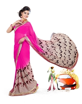 Cream Georgette & chiffon saree with a pink art silk blouse with lace border work.