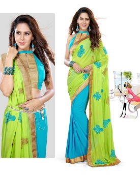 Green Georgette & chiffon saree with a sky blue art silk blouse with lace border work.
