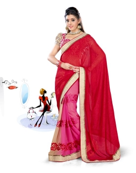 Red Georgette & chiffon saree with a golden art silk blouse with lace border work.