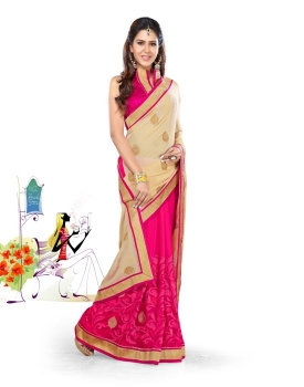 Chikoo net saree with a pink art silk blouse with lace border work.