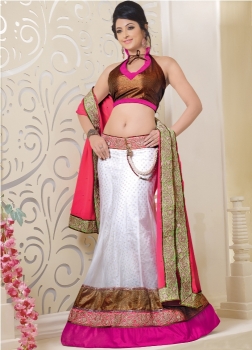 Off White Semi Stitch net Lengha with maroon art silk choli and pink chiffon dupatta.