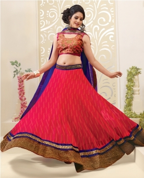Pink net Semi Stitch Lengha with pink dhupion choli & blue net dupatta.