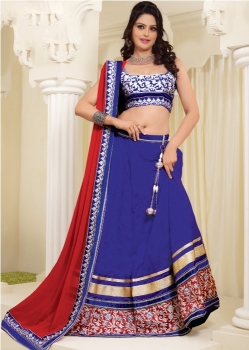 Blue Silk Jacquard semi stiched Lengha with blue dhupion choli & maroon chiffon dupatta.