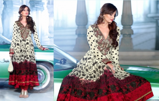 Cream Georgette kameez, maroon santoon bottom & cream Pure Chiffon dupatta with santoon inner and Zari, resham embroidery with stone work and lace patta Work.