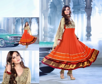 Orange pure Georgette kameez, Cream santoon bottom & cream Pure Chiffon dupatta with santoon inner and Zari, resham embroidery with stone work and lace patta Work.