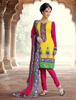 Yellow Pure Banarasi Jacquard kameez, pink santoon bottom & pink pure chiffon dupatta with Resham Embroidery and Stone Work.