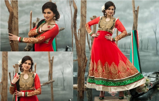 Red georgette kammez, red santoon bottom & green & black chiffon dupatta with Heavy Zari, resham embroidery with stone work and Lace border.