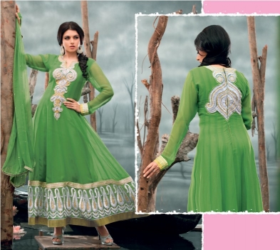 Green georgette kameez, green santoon bottom & green chiffon dupatta with Heavy Zari, resham embroidery with stone work and Lace border.