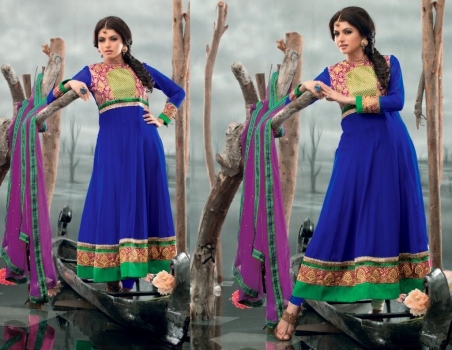 Blue georgette kameez, blue santoon bottom & pink chiffon dupatta with Heavy Zari, resham embroidery with stone work and Lace border.