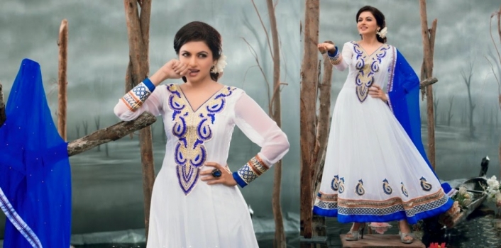 Off-white georgette kameez, off-white santoon bottom & blue chiffon dupatta with Heavy Zari, resham embroidery with stone work and Lace border.