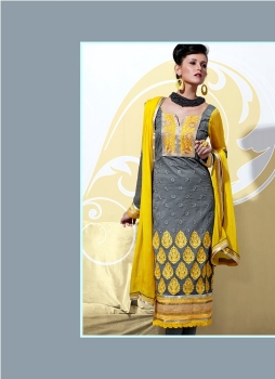 Grey cotton kameez & bottom, yellow chiffon dupatta with Zari, resham embroidery and Lace border