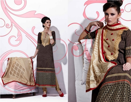 Coffee cotton kameez & chikoo bottom, chikoo art silk dupatta with Zari, resham embroidery and Lace border