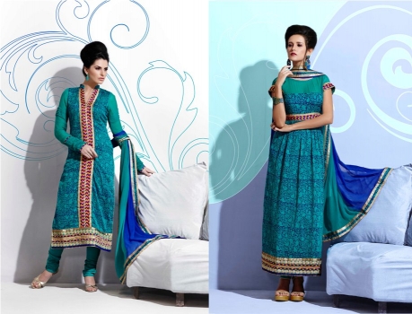 Green cotton kameez & bottom, green blue chiffon dupatta with Zari, resham embroidery and Lace border