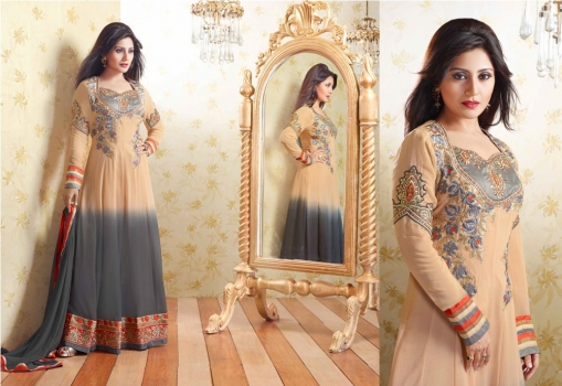 Cream+Grey georgette kameez, cream santoon bottom, grey chiffon dupatta with Heavy Zari, resham embroidery with stone work and Lace border.