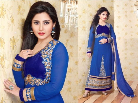 Blue georgette kameez, blue santoon bottom, blue chiffon dupatta with Heavy Zari, resham embroidery with stone work and Lace border.