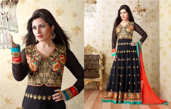 Black georgette kameez, black santoon bottom, orange chiffon dupatta with Heavy Zari, resham embroidery with stone work and Lace border.