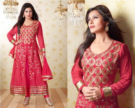 Pink georgette kameez, pink santoon bottom, pink chiffon dupatta with Heavy Zari, resham embroidery with stone work and Lace border.