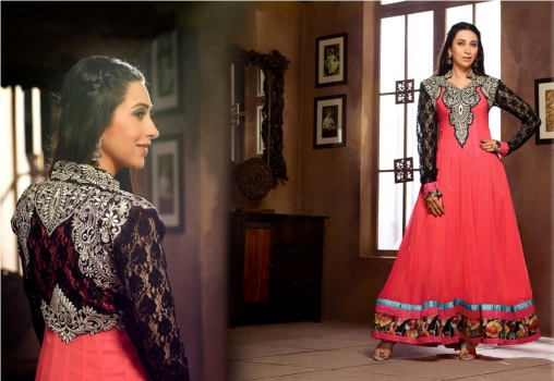 Pink Georgette+Sleeves Net Brasso kameez, pink santoon bottom,, pink chiffon dupatta with Zari, resham embroidery with stone work and Lace border.