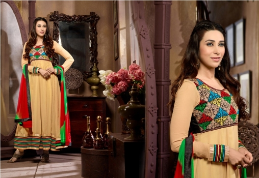 Cream georgette kameez, cream santoon bottom, maroon+green chiffon dupatta with Zari, resham embroidery with stone work and Lace border.