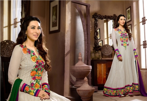 Grey net kameez, grey santoon bottom, purple chiffon dupatta with Zari, resham embroidery with stone work and Lace border.