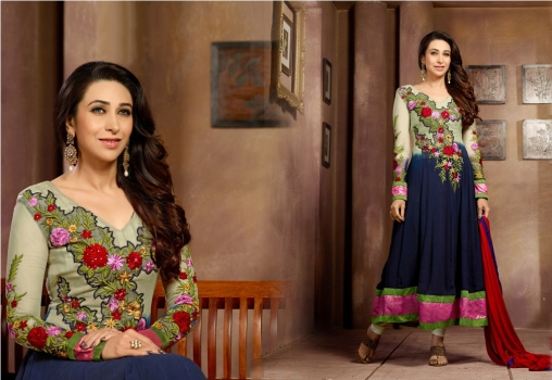Blue georgette kameez, white santoon bottom, maroon chiffon dupatta with Zari, resham embroidery with stone work and Lace border.