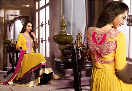 Yellow georgette kameez, yellow santoon bottom, pink chiffon dupatta with Zari, resham embroidery with stone work and Lace border.