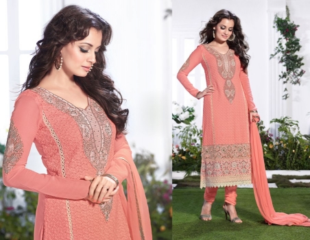 Light Orange georgette kameez, Light Orange santoon bottom, Light Orange chiffon dupatta with Zari, resham embroidery with stone work and Crosia lace border.
