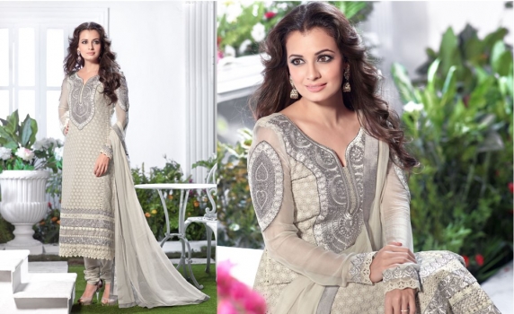 Grey georgette kameez, grey santoon bottom, grey chiffon dupatta with Zari, resham embroidery with stone work and Crosia lace border.