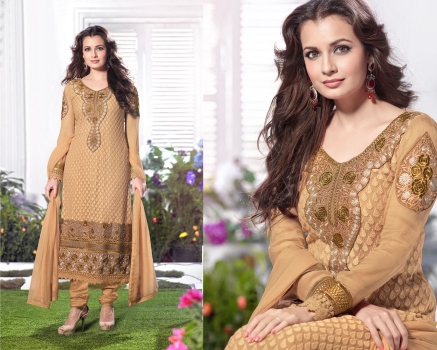 Cream georgette kameez, cream santoon bottom, cream chiffon dupatta with Zari, resham embroidery with stone work and Crosia lace border.