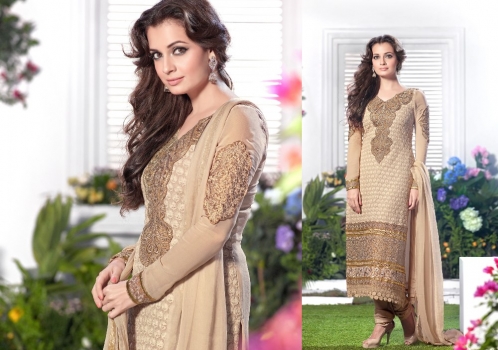 Chikoo georgette kameez, Chikoo santoon bottom, Chikoo chiffon dupatta with Zari, resham embroidery with stone work and Crosia lace border.
