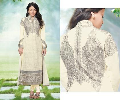 Cream georgette kameez, cream santoon bottom, cream chiffon dupatta with Zari, resham embroidery with stone work and Lace border.