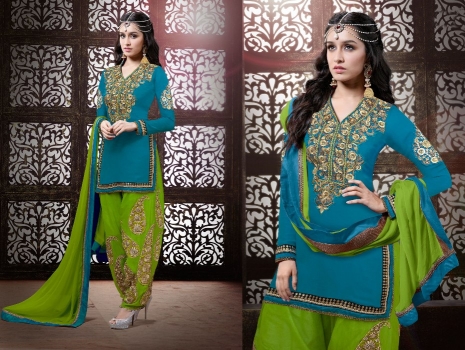 Blue georgette top, green Georgette (Inner-Santoon, Embroidery Work) bottom, green chiffon dupatta with santoon inner & Heavy Zari, resham embroidery with stone work and Lace border.