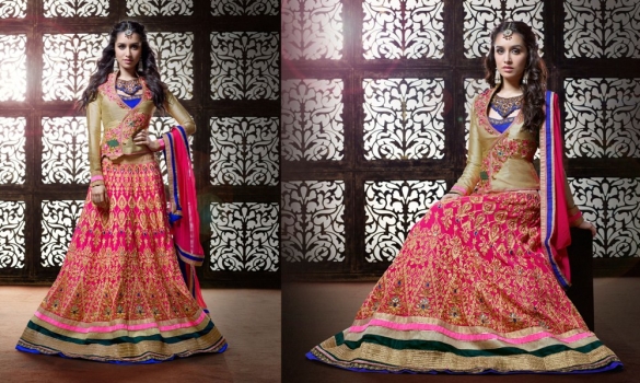Cream blue dhupion choli ( Bust: 40), pink georgette 4 piece georgette lehenga (Waist:"42"), (Length:"43"), pink chiffon dupatta with santoon inner & Heavy Zari, resham embroidery with stone work and Lace border.