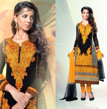 Black Georgette top, orange Santoon bottom, Black+orange chiffon dupatta with santoon inner & Zari, resham embroidery and Lace border .