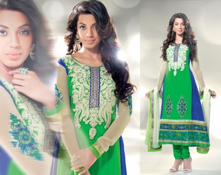 Green+blue Georgette top, green Santoon bottom, off-white chiffon dupatta with santoon inner & Zari, resham embroidery and Lace border .