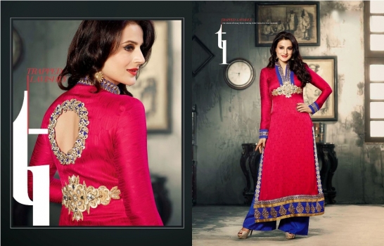 Magnificient Fuchsia coloured jacquard Salwar Kameez Comes With A Contrast Blue Chiffon Dupatta & Butta Work|Lace|Moti|Patch Work|Resham|Self|Stones.