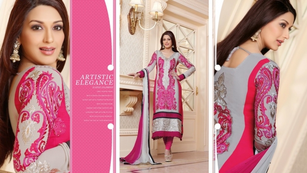 Dazzling Diva Fuchsia & Gray Faux Geprgette Salwar Kameez with Butta Work|Kashmiri|Lace|Resham|Stones work.