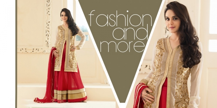 Chic Beige & Red Faux Georgette Salwar Kameez Comes With A Matching Dupatta Paired With A Matching Bottom & Resham|Stones work.